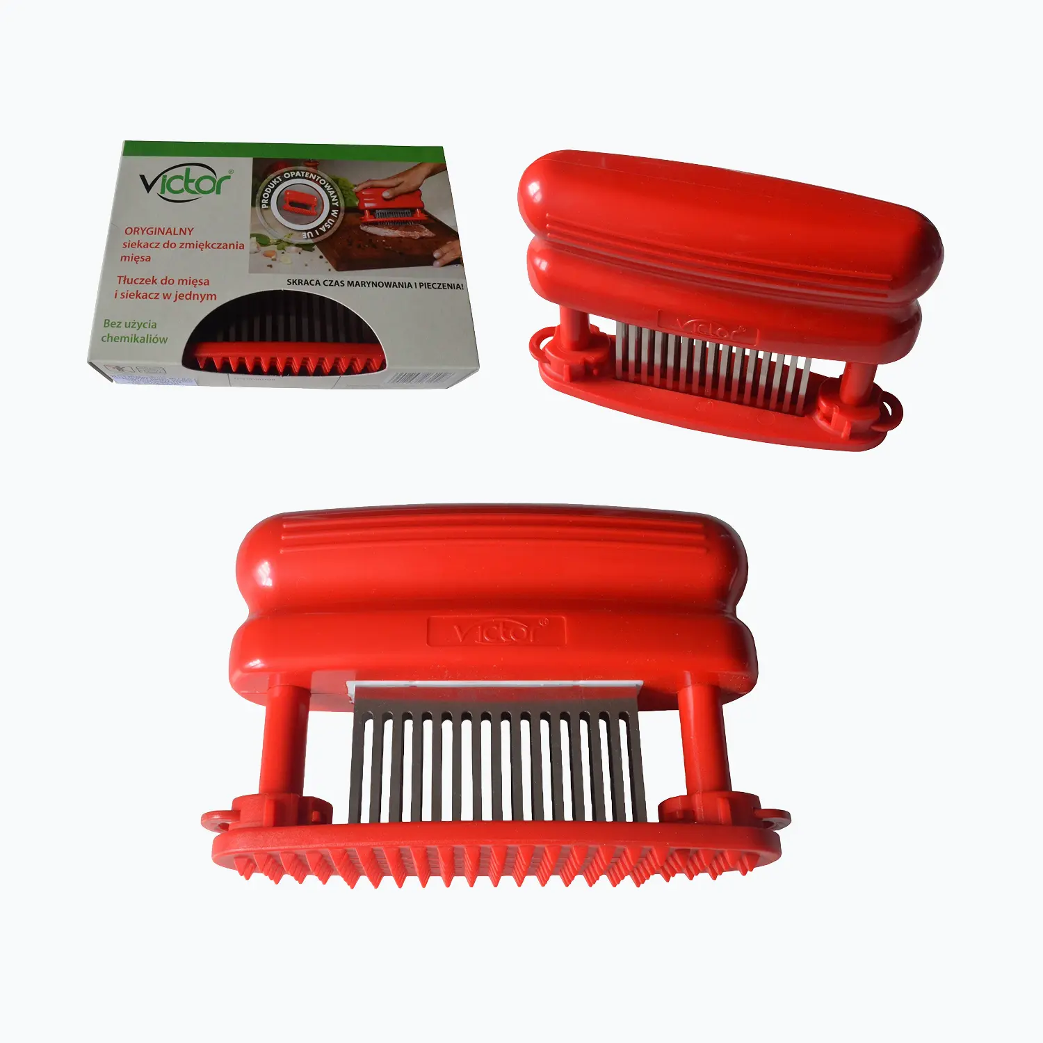VictorSiekacz zmiękczający do mięsa Victor to profesjonalny nakłuwacz zaprojektowany do szybkiego przygotowania mięsa bez użycia chemicznych zmiękczaczy. Opatentowana technologia nacinania włókien sprawia, że marynaty wchłaniają się nawet do 80% szybciej, a czas smażenia, grillowania lub pieczenia skraca się nawet o 50%.